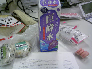 ウチの1ℓパックの飲み物と、みんなに配るおやつと、夜食のおにぎり×2。