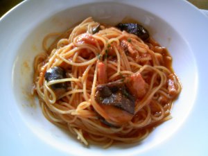 ベーコンと茄子のトマトソース。